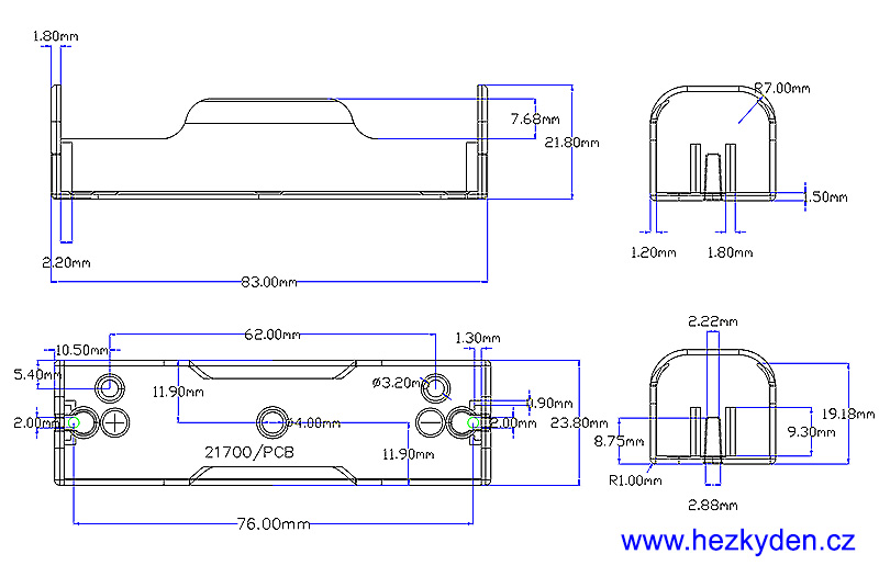 Pouzdro na baterie 21700 DPS - rozměry