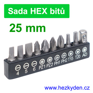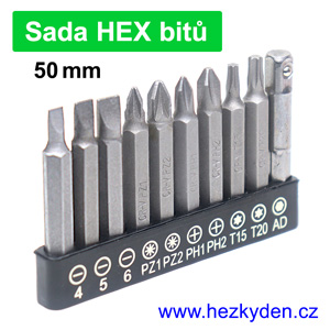 Sada deseti nejpoužívanějších HEX bitů délky 25mm a 50mm z chrom-vanadiové oceli. Včetně černého plastového držáku.